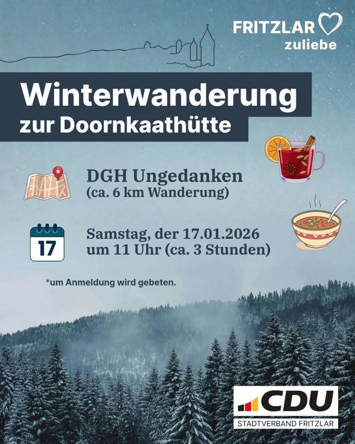Wir beginnen das neue Jahr mit einem Winterspaziergang am 17.01.2026. Wir treffen uns um 11 Uhr am DGH Ungedanken und laufen ca. 6km. Da es am Ende der Wanderung eine kleine Stärkung geben wird, bitten wir um Anmeldung an theiss@cdu-fritzlar.de oder direkt bei unserem Bürgerbriefkasten.