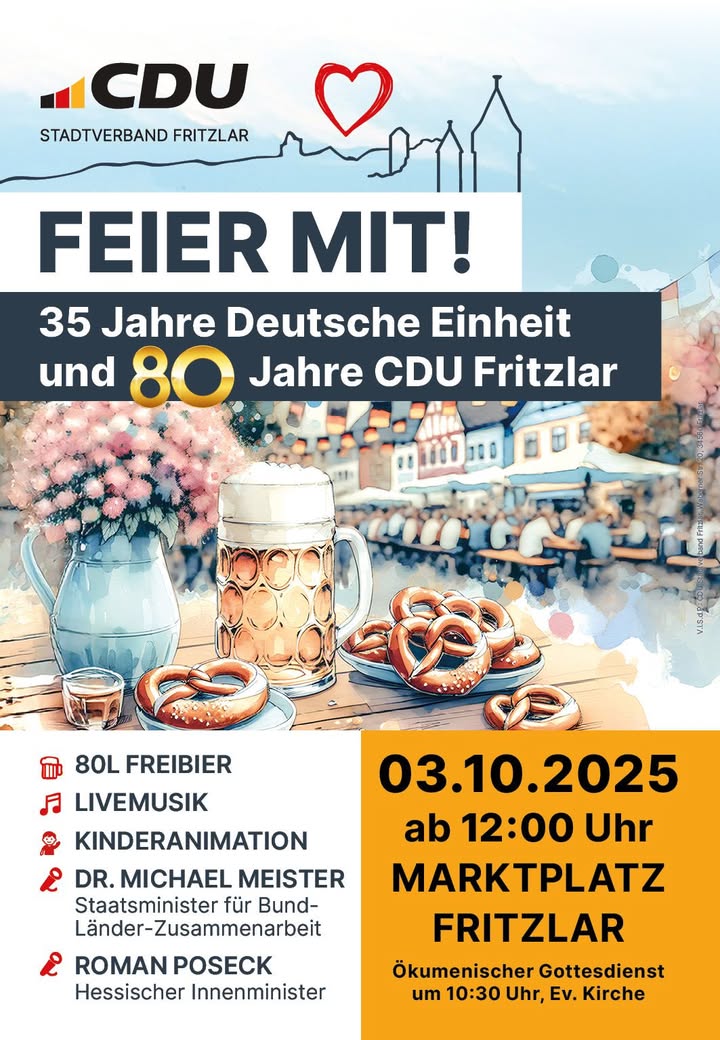 mehr🇩🇪 Wir feiern 35 Jahre Deutsche Einheit.🥳 Außerdem wird die CDU Fritzlar in diesem Jahr 80 Jahre alt. Deshalb spendiert der Stadtverband zur Feier des Tages gleich 80 Liter Freibier.🍻 Natürlich von Brauhaus 1880!🎤 Weitere Highlights sind die Grußworte von Staatsminister Dr. Michael Meister, Innenminister Poseck sowie unseres Bürgermeisters Hartmut Spogat.🎺 Zünftige Blasmusik gibt es wie gewohnt von unseren Freunden vom Musikverein Ungedanken. Schön, dass ihr wieder dabei seid!👩🎨 Aktionen für Kinder bietet die Junge Union an.🍽 Als Verpflegung gibt es traditionell die Erbsensuppe vom Lindenhof sowie Bratwurst und Pommes.🍰 Danke an die Eddernarren, dass ihr wieder selbstgemachten Kuchen mitbringt und uns bei der Bewirtung unterstützt!🍷 Neu ist, dass in diesem Jahr Wein aus der Weinstiege ausgeschenkt wird.⛪️ Der Tag beginnt bereits um 10:30 Uhr mit einem ökumenischen Gottesdienst in der Stadtkirche. Das Fest auf dem Marktplatz geht dann um 12 Uhr richtig los.😄 Wir freuen uns auf Euer Kommen!