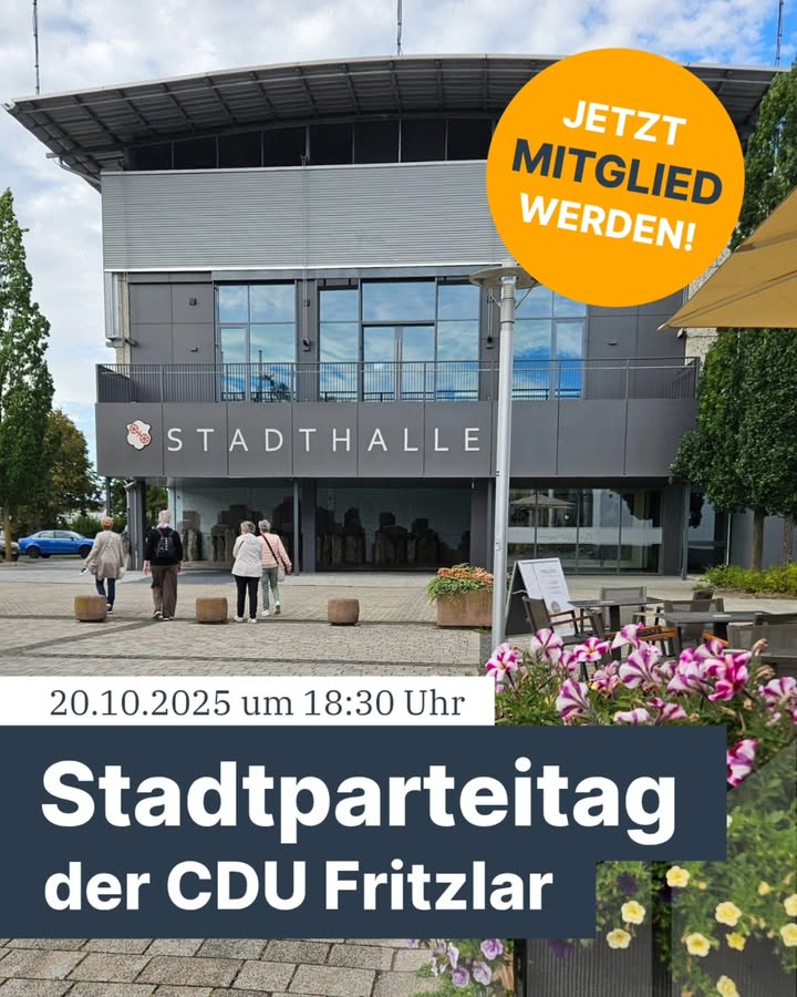 mehr📬 Wir laden alle Mitglieder unseres Stadtverbandes zum diesjährigen Stadtparteitag der CDU Fritzlar ein.🗳 Wir werden einen neuen Vorstand und die Delegierten für den Kreisparteitag wählen. Außerdem wird die Kandidaten-Liste für die Gemeindewahl beschlossen.🗓 Montag, der 20.10.2025🕡 18:30 Uhr📍Stadthalle Fritzlar (kleiner Saal)❤️ Wir freuen uns auf Ihr Kommen und danken für Ihr Engagement zum Wohle unserer Heimatstadt und unserer Partei!❓️Sie sind noch kein Mitglied? Haben aber Lust, Fritzlars Zukunft politisch mitzugestalten? ❗️Dann werden Sie Mitglied in Fritzlars aktivster und größter Partei! Werden Sie CDU-Mitglied!Alle Infos dazu finden Sie auf unserer Website. Sie können uns aber auch eine Nachricht schreiben.Ihre CDU Fritzlar#fritzlarzuliebe #cdufritzlar #fritzlar