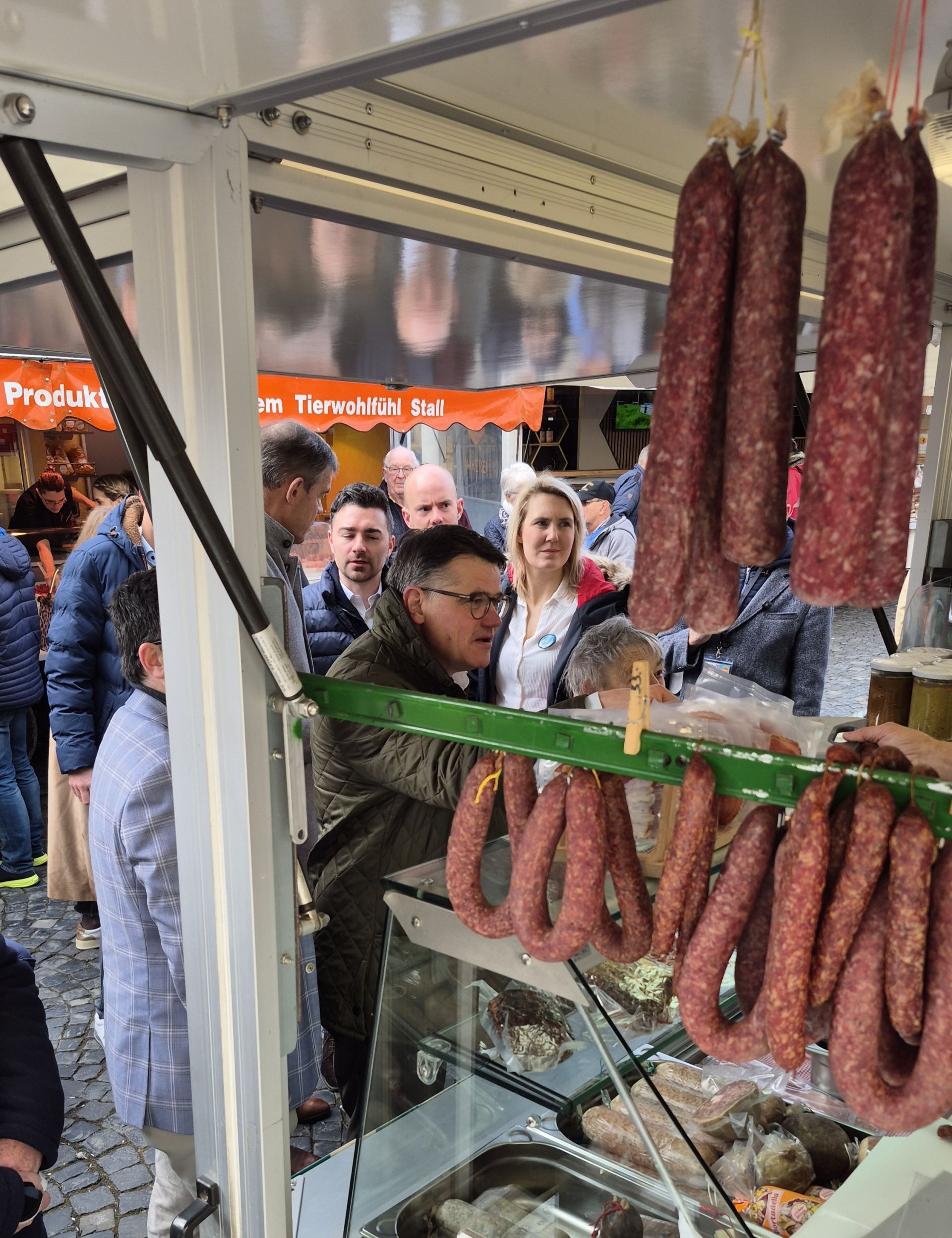 Auf dem Marktplatz suchte der Ministerpräsident das Gespräch mit den Marktbetreibern und kam auch kulinarisch auf seine Kosten: Mit sichtlicher Freude probierte er ein Stück Ahle Wurscht vom lokalen Landwirt – ein echtes Stück nordhessische Kultur.