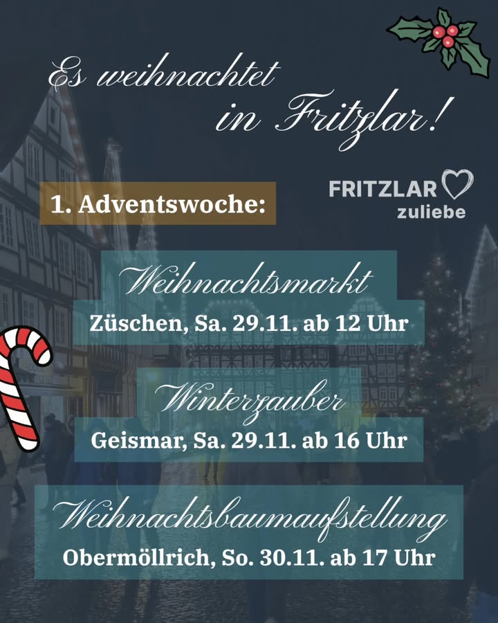 mehr✨️ Die Adventszeit beginnt und Fritzlar zeigt sich weihnachtlich geschmückt von einer der schönsten Seiten. 🎄 Am ersten Adventswochenende laden folgende Veranstaltungen zum gemeinschaftlichen Verweilen ein: ? Weihnachtensmarkt in der Zehntscheune in Züschen am Samstag von 12-18 Uhr? Winterzauber auf dem historischen Gehöft in Alt-Geismar am Samstag ab 16 Uhr? Weihnachtsbaumaufstellung am Dorfpark Obermöllrich, Sonntag ab 17 Uhr🕯Viel Spaß und einen friedlichen ersten Advent!#fritzlarzuliebe #fritzlar #cdufritzlar
