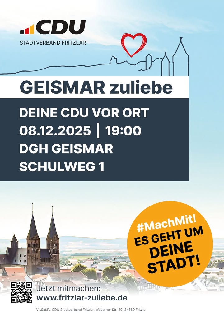 mehr❓️️Dich interessiert, was gerade in der Stadtpolitik los ist?❗️️Dann MACH MIT bei der offenen Fraktionssitzung in Geismar!🕖 8. Dezember um 19 Uhr📍 Dorfgemeinschaftshaus (Schulweg 1)🏁 Ziel: Wir möchten wissen, was die aktuellen Themen in Geismar sind und gleichzeitig über unsere Arbeit informieren.Darum laden wir den Ortsbeirat, die örtlichen Vereine, aber natürlich auch alle anderen Menschen in Geismar herzlich ein, zu unserer Sitzung zu kommen.ℹ️ Hintergrund: Jede Stadtverordnetenversammlung bereitet unsere Fraktion in 2 Fraktionssitzung vor. Wir besprechen die Tagesordnung und sammeln Ideen für Anräge.#geismar #fritzlarzuliebe #cdufritzlar #fritzlar