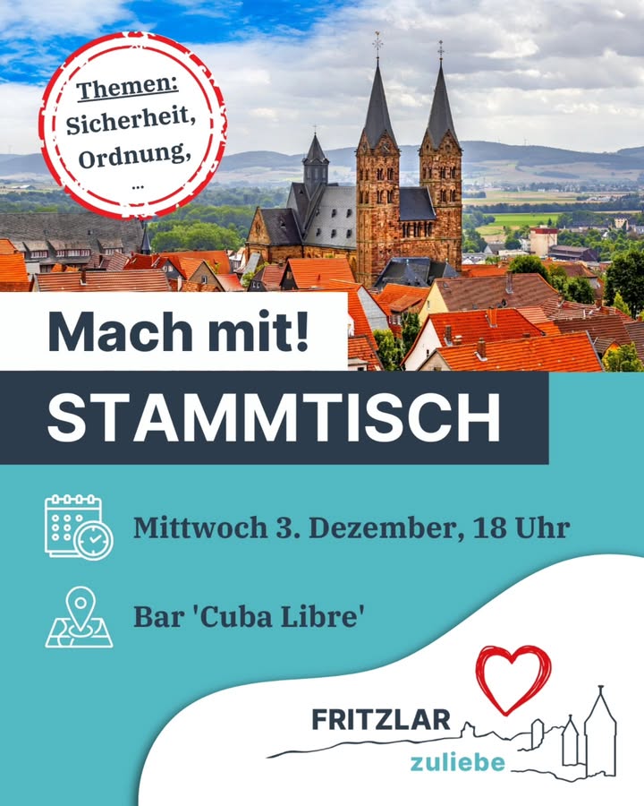mehr🍻 Mach mit beim offenen Stammtisch!Wir sprechen über die Themen unserer Stadt, Bundespolitik oder auch einfach Persönliches. 👮♂️ Dieses Mal soll es insberondere um das Sicherheitsgefühl und Ordnung in Fritzlar gehen.🕕 Mittwoch, den 3. Dezember um 18 Uhr. 📍Wir treffen uns wieder bei leckeren Getränken im @cuba.libre.fritzlar 🍹🍺