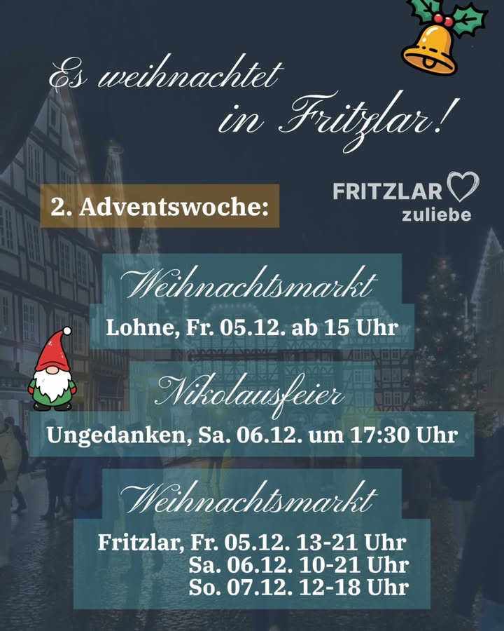 🎄 Der Weihnachtsmarkt steht vor der Tür. Dieses Wochenende gibt es Glühwein, Geschenke, Leckereien und vieles mehr in der weihnachtlich geschmückten Altstadt.✨️ Außerdem gibt es am Freitag einen kleinen Weihnachtsmarkt am Dorfplatz in Lohne.🎅 Und in Ungedanken schaut am Samstag der Nikolaus im Feuerwehrhaus vorbei.🕯🕯 Auf ein friedliches 2. Adventswochenende!#fritzlarzuliebe #cdufritzlar
